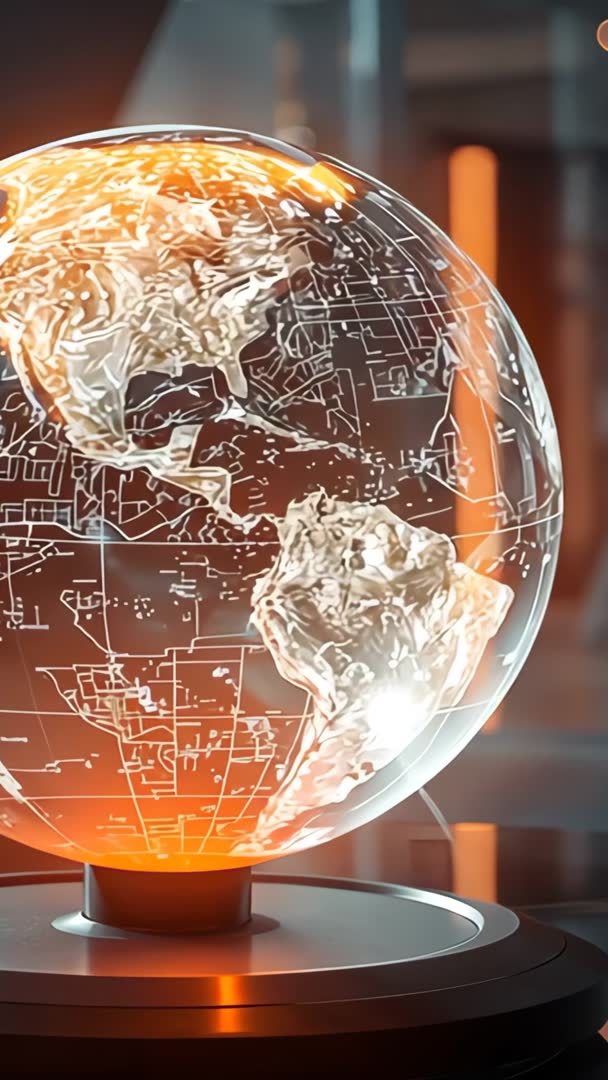 AI Generated Image. Vertical clip showcasing rotating glass-like holographic globe mounted on metal base, overlaid with detailed circuit-style world map and pulsing orange LED highlights. Camera slowly panning while globe rotating, focusing on North and South America with crisp reflections and shallow depth of field. Ambient studio lighting creating warm orange highlights and cool metal tones, conveying futuristic and cinematic mood. Circuit traces tracing network paths and data routes, suggesting connectivity, cybersecurity, and global infrastructure. Visual style offering clean futuristic aesthetic and strong center composition for vertical framing. Usage ideas: Use for technology product promos, cybersecurity or network operations branding, fintech and logistics presentations, website hero headers, app preview reels, vertical social media ads, corporate pitch decks, broadcast tech segments, or science documentary openers. Clip designed for looping and easy integration into motion graphics and title sequences, allowing seamless color grading and overlay customization for brand alignment.
