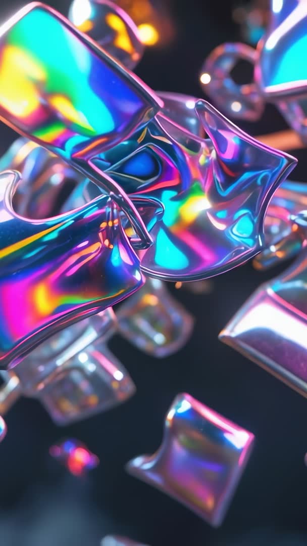 AI Generated Image. Vertical looping video showing rotating holographic ribbons and floating fragments reacting to shifting studio light. Iridescent surfaces reflecting neon cyan, magenta, purple, gold, and electric blue, creating futuristic high-energy atmosphere. Close-up 3D motion featuring smooth camera moves and soft bokeh highlights, maintaining loop-friendly timing for seamless playback. Ideal for mobile app intros, social media stories, music visualizers, product promo backgrounds, tech presentations, VJ sets, and event visuals. Suggested use includes placing overlay text or logo on dark lower third, applying subtle color grade to match brand palette, and exporting as MP4 or ProRes for vertical delivery. Working well with motion design projects, CGI montages, and creative advertising campaigns seeking vibrant, modern abstract motion.