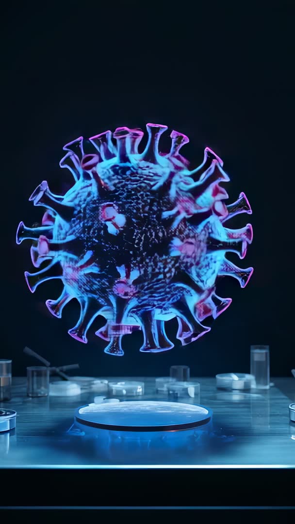 - Rotating holographic virus model pulsing above glowing lab platform with vials, vertical