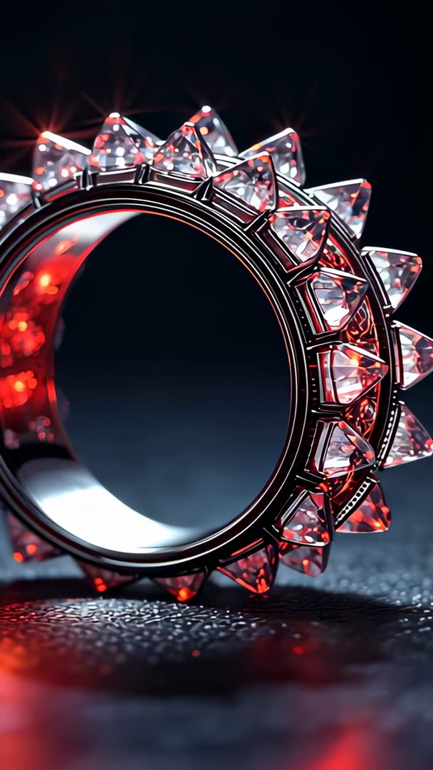 - Rotating jeweled ring reflecting red light and casting highlights in vertical video