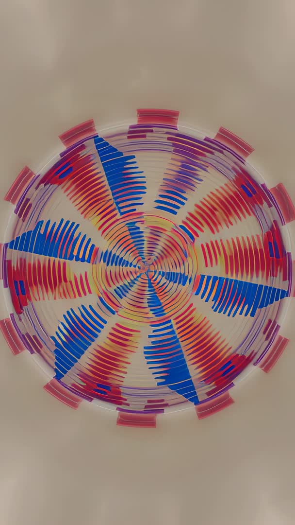 AI Generated Image. Video showing rotating disc with radial blue wedges and red tabs pulsing on beige background. Circular pattern forming concentric circles and rippling color bands while disc slowly spinning. Visual offering hypnotic kaleidoscopic motion and bold primary color contrast. Ideal for vertical mobile content, looping social media stories, music visualizers, app splash screens, VJ performances, modern art projections. Clip working well for branding, promotional loops, meditation or focus exercises, tech demos, and creative presentations. Footage delivering loop-friendly motion, strong center composition, and high-contrast color blocks for easy masking and overlay. Try speeding up or slowing down playback, adding synced audio pulses, or layering text and logos for title cards, transitions, or background visuals.