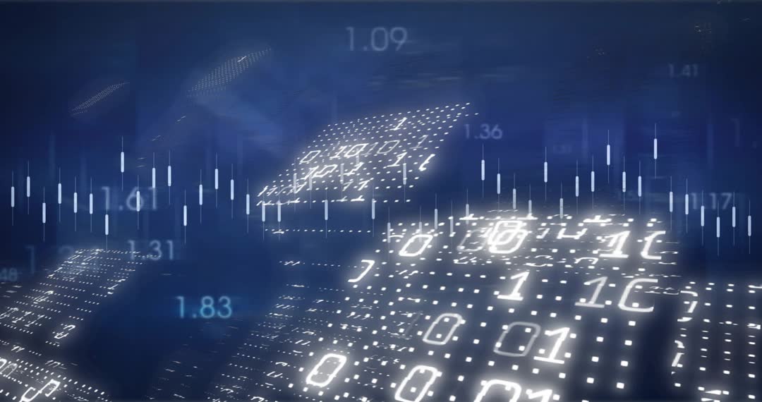 Looping motion graphic featuring rotating LED panels displaying flowing binary numbers and pulsing equalizer bars. Orange line graph animating across panels while vertical columns and waveform elements reacting to data rhythm. Parallax camera movement creating depth and holographic glow adding futuristic atmosphere. Deep blue palette with amber highlights and bright white LED points creating high-tech contrast. Ideal for technology presentations, fintech promos, broadcast intros, website hero backgrounds, trade show screens, VJ sets, and social media animated posts. Video working well as background loop, header animation, overlay behind text, or visual accompaniment for analytics and data-driven storytelling. Looping seamless for long displays, optimized for 4K and HD projects, compatible with broadcast and online formats. Leave negative space for text overlays and lower third graphics, use with logo reveals and data-driven transitions.