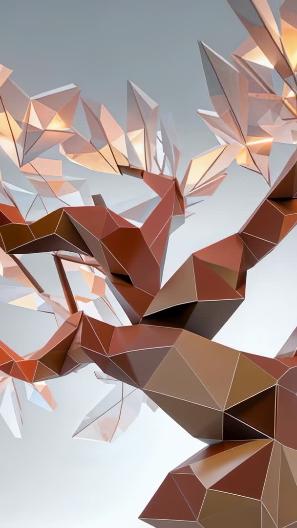 AI Generated Image. Vertical video showing rotating low poly sculpture with faceted branches and glowing peach leaves, filmed in studio with soft directional lighting. Clean minimalist composition favoring vertical frame, matching mobile-first platforms and social stories. Footage working well for startup branding, app splash screens, product reveal sequences, motion graphics backdrops, gallery projections. Color palette featuring warm peach highlights and copper geometry, supporting luxury, design, and tech narratives. Clip providing loopable background and hero animation for web, keynote, advertising, and social ads.