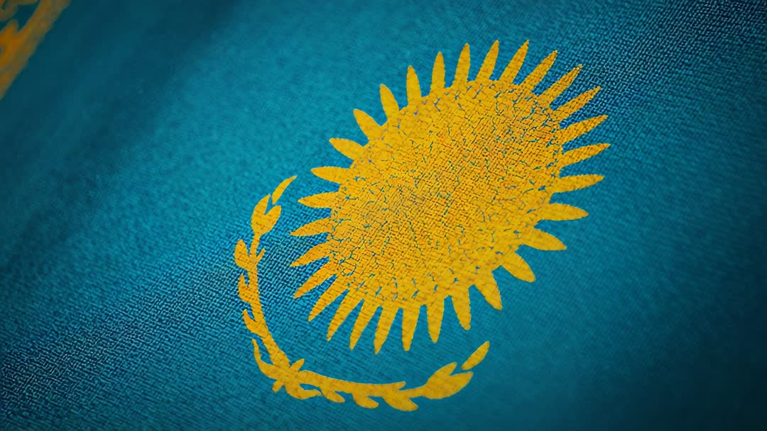 - Rotating macro footage revealing gold sun emblem on woven Kazakhstan flag stitching