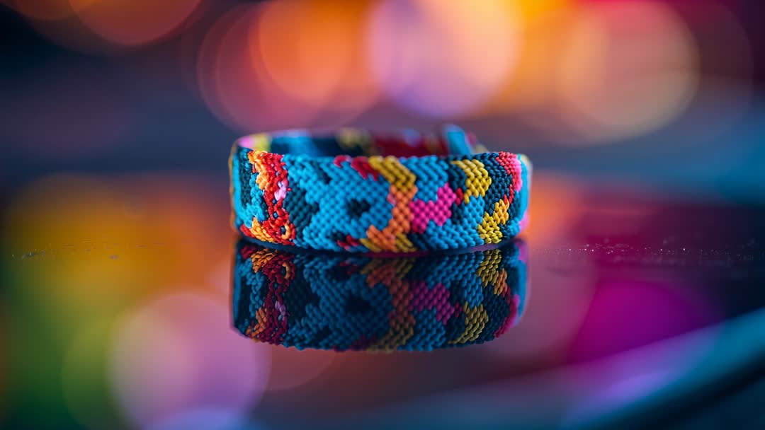 AI Generated Image. Showing rotating macro of woven friendship bracelet resting on reflective glass, featuring bold zigzag pattern and vivid color palette. Soft studio lighting creating colorful bokeh and mirror reflection, highlighting thread texture and weave detail. Useful for product showcase videos, social media reels, e-commerce listings, craft tutorials, jewelry lookbooks, fashion blog headers, festival style promotions, handmade marketplace listings. Suitable for hero banners, video thumbnails, ad creatives, packaging mockups, mood boards. Pairing with overlay text, logo, or price tag for promotional use. Offering versatile visual for emphasizing craftsmanship, color combinations, DIY instructions, gift guides, summer accessory campaigns.