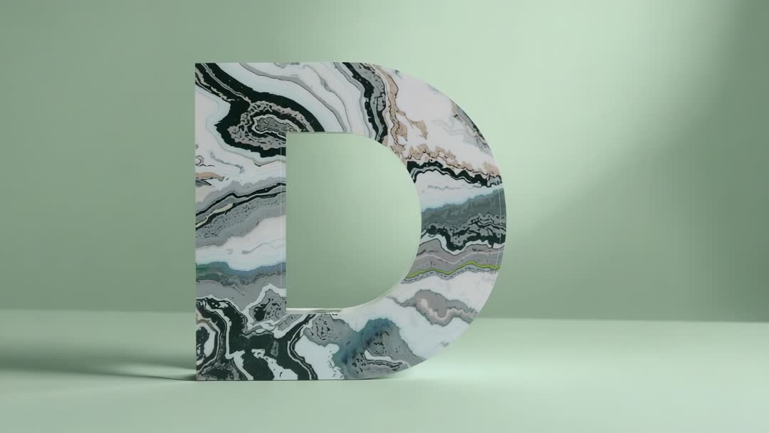 AI Generated Image. Animation showcases a rotating marbled 3D letter D, set against a subtle green background, emphasizing marble veining and texture. Glossy surface of the letter adds a modern and stylish touch, suitable for branding videos, typography projects, and design showcases. Ideal for presentations aiming to enhance creative branding or for educational content about materials in graphic design.