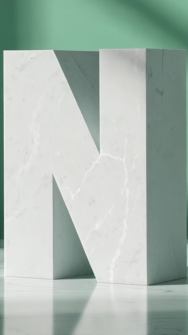 AI Generated Image. Rotating marble letter N against mint green backdrop, casting soft shadows across glossy white floor. Showcasing minimalist sculpture, clean geometry, and refined marble veining for premium visual identity. Serving as vertical branding opener, logo reveal, social media ad, Instagram Story, Reel, or TikTok clip. Providing loop-friendly motion and cinematic lighting for smooth transitions and on-screen text overlay. Allowing easy color grading, compositing with brand assets, and placement of typography or product shots. Suitable for luxury product launches, interior design portfolios, typographic campaigns, packaging mockups, and motion design templates. Delivered in high-resolution vertical formats ready for mobile and web platforms.