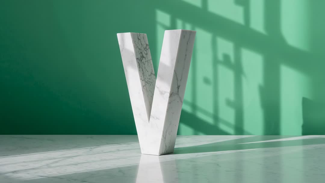 AI Generated Image. This video captures a detailed view of a marble 'V' sculpture standing on a marble surface, accented by a vibrant green background and sunlight casting geometric window shadows on the wall. Ideal for projects emphasizing contemporary art, interior design elegance, or the subtle interplay of light and shadow. The texturally rich setup suits use in ads and articles focused on modern art aesthetics or minimalistic interior design trends.