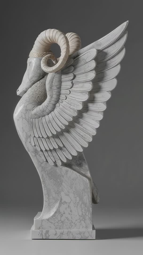 AI Generated Video. Rotating marble winged-ram sculpture revealing curled horns, layered carved wings, subtle veining, and polished surface against neutral gray backdrop. Vertical-framed video capturing slow 360-degree rotation, emphasizing form, texture, shadow, and negative space. Suiting vertical social media reels, Instagram Stories, TikTok, mobile ads, and gallery website hero loops. Serving editorial content for contemporary art, sculpture, architecture, design features, and luxury decor catalogs. Useful as motion background for product launches, brand campaigns, museum exhibition promos, creative portfolios, and concept presentations. Delivering minimalist, monochrome aesthetic for projects requiring elegance, calm, and classical-meets-modern contrast. Available for looping, slow-motion, and close-up crop variations.