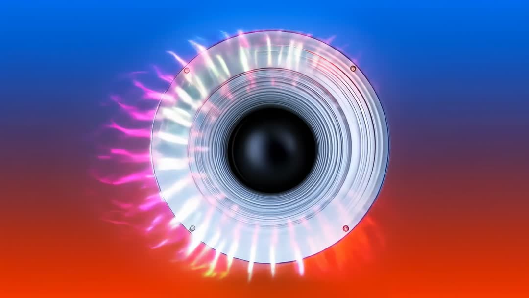 AI Generated Image. Video showing rotating metal diaphragm spinning forward over blue-to-red gradient while emitting vibrant pink and white plasma tendrils. Central black aperture forming lens-like focal point with concentric rings adding mechanical depth and tactile detail. Neon glow and radial motion conveying futuristic energy, AI tech interface, or sci-fi power core concept. Serving as looping background for tech presentation, startup landing page hero, VJ visual set, music video overlay, title sequence, product demo intro. Colorful gradient and high-contrast glow fitting marketing, web design, UI animation, motion graphics, and event visuals. Offering easy customization through color grading, speed ramping, and crop for vertical or square social formats.