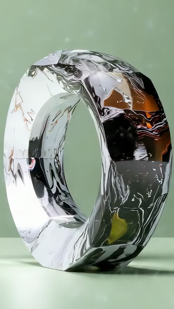 AI Generated Image. Rotating torus sculpture spinning clockwise on soft green surface, reflecting light and warm highlights, with floating particles drifting in background. Minimalist futuristic aesthetic blending chrome and glass-like materials. Ideal for background loops, motion graphics, product presentation, tech or design promos, social media reels and website hero banners. Offering vertical 9:16 format, loop-friendly rotation, and clean negative space for text overlays and titles. Suitable for modern art features, architecture and design editorials, advertising, presentations, and creative visual experiments.