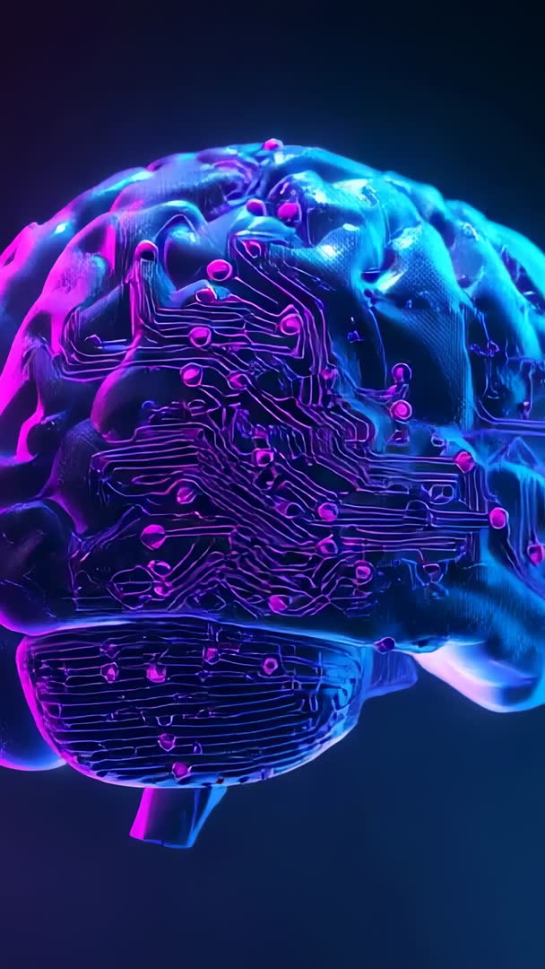 AI Generated Image. Video showing rotating stylized brain rendered in neon blue and magenta, revealing intricate circuit tracings and glowing nodes across cortical surface against dark void. Visual combining organic brain anatomy with electronic circuitry, evoking neural networks, AI, brain-computer interfaces, cybernetics, and futuristic innovation. Ideal for illustrating machine learning algorithms, data processing, tech research, and digital neuroscience storytelling. Usage ideas: using as background for tech presentations, hero video for AI startup websites, social media reels and vertical ads, product launch teasers, conference openers, editorial features on neuroscience and technology, e-learning modules on artificial intelligence, broadcast bumpers, and sci-fi trailers. Customization tips: color grading to match brand palette, adding animated overlays or data visualizations, syncing loop for short-form vertical content, and cropping for story or reel formats. Technical notes: vertical 9:16 orientation, loop-friendly composition, high contrast neon palette, close-up detail emphasizing circuitry texture and node highlights.