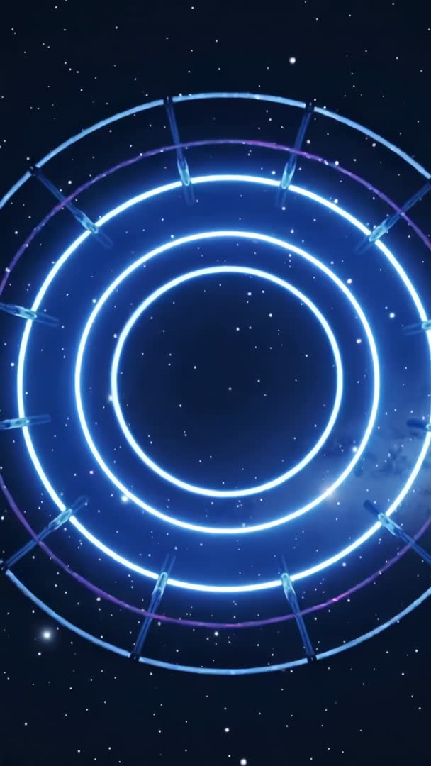 AI Generated Image. Vertical loop showing concentric neon rings rotating and scaling against starry cosmic backdrop, highlighted by glowing blue rings and subtle pink band. Futuristic struts orbiting rings, adding depth and geometric symmetry. Clean negative space in center allowing logo placement or text overlay. Looping motion creating hypnotic tech vibe for music visuals, event intros, social media vertical ads, app backgrounds, and VJ performances. Color palette working for cyberpunk, electronic, and sci-fi projects. Recommended uses include hero background for vertical landing pages, story posts, intro loops for livestreams, title reveal animations, and UI transitions. Compatible with 4K vertical timelines and motion graphics templates, ideal for editing with blend modes and glow effects.