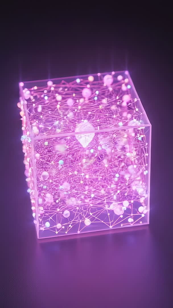 AI Generated Image. Showing rotating clear cube with pulsing core and intricate filament network glowing in magenta and cyan. Nodes flashing and particles drifting while filaments trace geometric lattice, producing sleek futuristic mood. Suiting vertical mobile formats such as reels and stories, loopable motion providing seamless background for tech promo, app intro, VJ visuals, or social media ads. Working well for futuristic branding, AI concept, network illustration, data visualization, event visuals, and music video overlays. Including dark lab tone for dramatic emphasis and easy color grading, ideal for editorial use, product launch clips, and digital signage.
