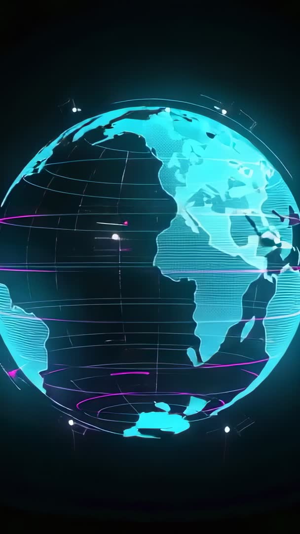 AI Generated Image. Rotating digital globe with glowing cyan continents and magenta orbit trails, pulsing nodes marking global connections. Floating orbit lines and subtle data streaks adding sense of motion and connectivity. Serving mobile apps, social stories, vertical ad creatives, and story reels with native 9:16 composition. Enhancing tech presentations, startup pitches, cybersecurity segments, data visualization, news graphics, and event intros. Looping friendly for continuous background playback. Color palette focusing on cyan and magenta neon tones for modern cyber aesthetic. Easy to combine with lower third graphics, logos, and text overlays. Providing eye-catching vertical visual for mobile-first campaigns and product launches.