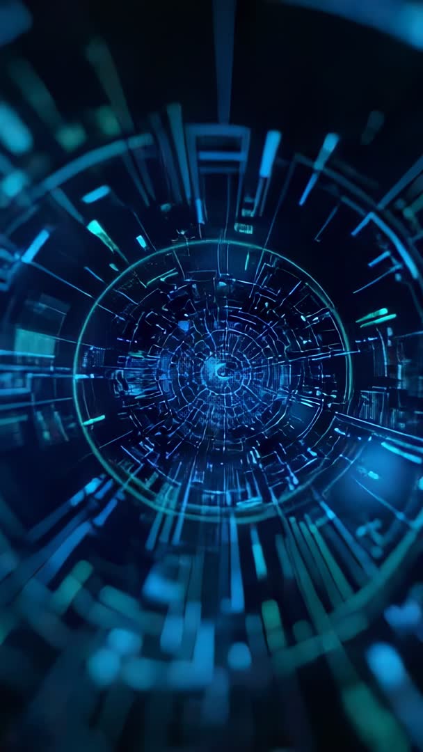 AI Generated Image. Vertical video featuring rotating central HUD pulling inward, pulsing concentric teal rings creating deep tunnel effect. Neon geometric elements and radial lines moving toward center, generating sense of speed and continuous data flow. High-contrast blue-green palette delivering futuristic cyber atmosphere and clean digital aesthetics. Ideal for tech presentations, app intros, UI demos, sci-fi title sequences, motion graphics backgrounds, social media stories, and advertising reels. Loopable animation suitable for mobile wallpapers, live event visuals, broadcast stings, and product promos. Color and speed customization recommended for brand alignment and mood tuning. Exporting tips: using MP4 or WebM codecs for vertical platforms, providing 9:16 aspect ratio and high bitrate for smooth playback.