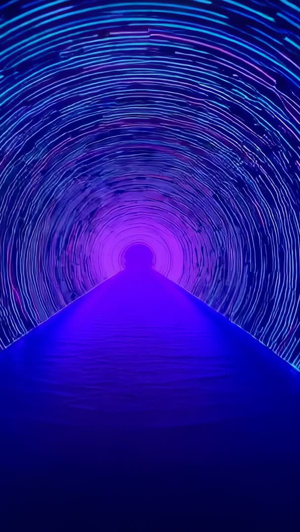 AI Generated Image. Showing rotating neon rings forming accelerating tunnel around glowing walkway platform, featuring radiant purple and electric blue palette and hypnotic radial motion. Creating immersive futuristic atmosphere suited for technology and entertainment applications. Serving as loopable vertical video optimized for mobile reels, stories, vertical ads, and digital signage. Supporting logo and text overlay, beat-synced audio integration, and color grading to match brand identity. Suggesting use as background for product launches, music visuals, concert and club backdrops, VJ loops, VR previews, social media campaigns, and UI motion design.