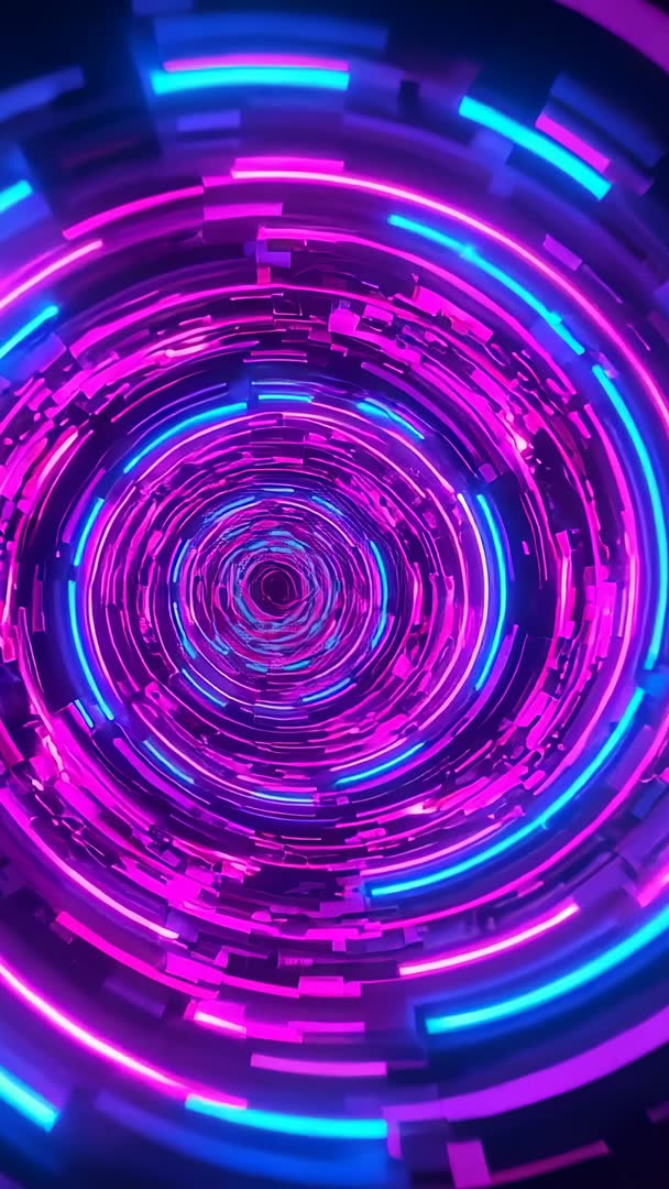 AI Generated Image. Rotating neon tunnel spiraling inward through cyber grid, pulsing pink and blue blocks and forming hypnotic vortex. Camera moving forward while fragments orbit and rim lights flashing, creating strong sense of depth and continuous motion. Enhancing music video intros, powering club and festival promos, elevating tech product launches, fueling app splash screens and social media reels, supplying livestream and VJ backgrounds, supporting futuristic advertising and brand campaigns. Optimized for vertical 9:16 delivery, loop-friendly for seamless playback, high contrast for overlay text, color grading friendly for custom palettes. Targeting motion designers, video editors, marketers, event producers seeking energetic cyberpunk visuals and immersive digital transitions.