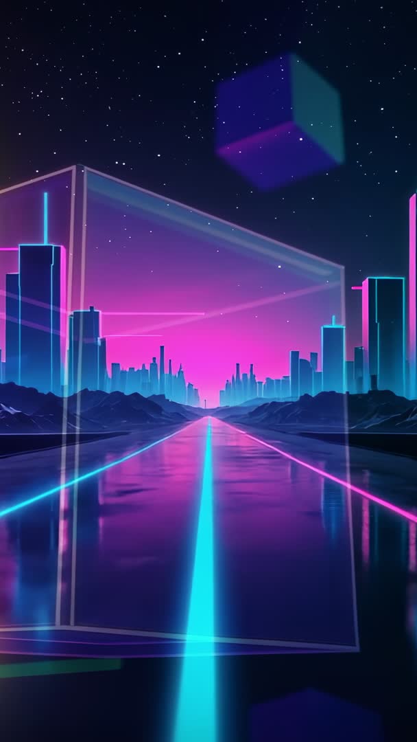 AI Generated Image. Featuring rotating glowing wireframe cube hovering above neon highway and framing futuristic city skyline under starry night. Strong central perspective with bright cyan and magenta highlights reflecting on wet road surface, producing deep sense of depth and motion. Visual mood blending synthwave and cyberpunk aesthetics with glossy retrofuturistic color palette. Ideal for tech promo backgrounds, music video intros, social media reels, mobile app demos, event visuals, and website hero loops. Creative suggestions: apply logo reveal on cube faces, add neon text overlays along road vanishing point, loop seamlessly for ambient displays, sync motion with electronic soundtrack, use slow motion or speed ramp for dramatic impact. Vertical aspect optimized for mobile-first campaigns and portrait video ads, easy to crop or extend for multi-platform use.