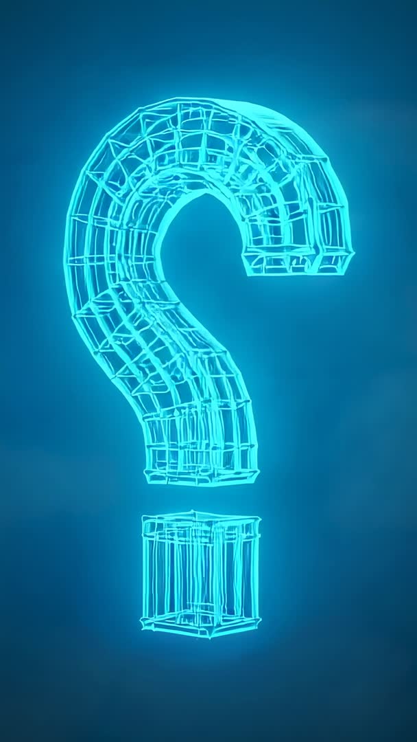 AI Generated Image. Looping vertical video showing rotating cyan wireframe question mark morphing into glowing exclamation cube against deep blue background. Holographic neon glow and detailed mesh lines creating futuristic, tech-driven atmosphere. Suiting mobile socials, app intros, FAQ and support pages, explainer content, cybersecurity promos, product launches. Seamless loop allowing continuous playback without jump; space for overlay text and logo at top or bottom. Providing easy customization with color grading, speed control, blending modes such as screen, and optional particle layers for added depth. Exporting as looped MP4 or GIF for fast web delivery; using as opener for YouTube Shorts, Instagram Reels, TikTok, vertical ad units, or background motion for presentations and pitch decks.