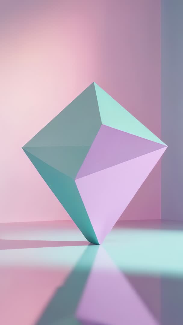 AI Generated Image. Vertical looping video showing rotating faceted polyhedron reflecting on glossy floor, bathed in mint and lilac gradient light. Clean geometric composition highlighting symmetry, crisp edges, soft shadow play and subtle motion. Perfect for motion background use in website hero sections, social media reels, mobile app intros, product presentations and tech or design promos. Optimized for portrait screens and vertical playback, supporting seamless loops and easy color grading to match brand palette. Creative suggestions: overlay bold text or logo in upper left negative space, animate subtle parallax for depth, use as ambient brand opener or backdrop for minimalist product reveal.