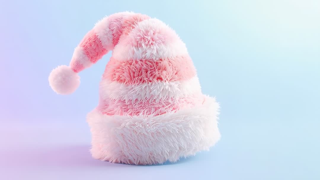 AI Generated Video. Video showing rotating pink and white fluffy Santa hat with pom pom against pastel gradient backdrop. Close-up revealing soft faux fur texture and plush pile under studio lighting. Perfect for holiday commercials, e-commerce product showcases, social media loops, greeting card animations, retail signage. Background offering soft duotone palette suitable for overlaying text or logos. File delivering 4K resolution and seamless looping for motion graphics and product demos. Mood conveying cozy, playful, whimsical holiday spirit ideal for winter campaigns and seasonal branding. Suggestions for use include hero loop on landing pages, animated banner ads, email headers, in-store screens, and packaging mockups. Color grading options include cooler blue tint or warmer pink tone for matching brand palette.