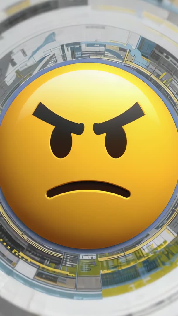 AI Generated Image. Presenting rotating metallic ring circling angry yellow emoji inside futuristic digital tunnel, starting with ring entering frame and looping seamlessly at clip start. Featuring high-contrast color palette and smooth 3D motion, creating bold visual impact for short-form vertical platforms. Ideal for social media reaction clips, tech news intros, app splash screens, streaming overlays, notification animations, and advertising for emotion-driven campaigns. Providing crop-safe central composition and seamless loop ready for 9:16 mobile playback. Pairing well with bold sound effects or short voiceover, and offering easy color grade customization for brand cohesion.