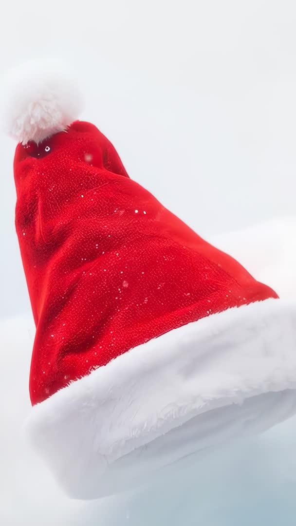AI Generated Video. Vertical holiday clip featuring rotating red Santa hat with fluffy white trim drifting over snowy field while gentle snow flurry falling. High-contrast crimson fabric and soft fur trim providing strong focal point and ample white space for overlay text or logos. Looping motion offering seamless social media reels, Instagram stories, TikTok ads, email headers. Ideal for seasonal promotions, retail signage, e-commerce banners, greeting card animations, festive background for product showcases. Color palette adapting easily to brand palettes while slow rotation creating calm, cozy mood. Usage tips: use 9:16 aspect ratio, add holiday soundtrack and bold headline, apply subtle vignette or drop shadow for depth and contrast.