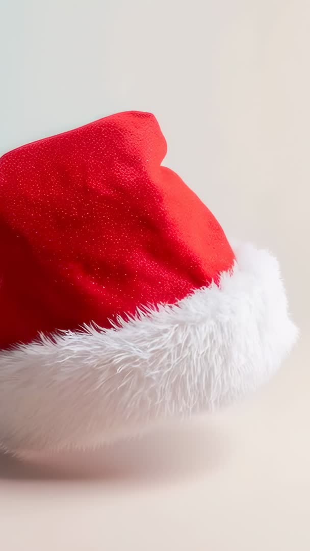 AI Generated Video. Showing close-up rotation of red Santa hat with fluffy white fur trim and pompom on neutral tabletop. Framing vertically for mobile-first platforms. Using soft lighting and shallow depth of field for highlighting fabric texture and fur detail. Looping seamlessly for holiday promos, social posts, Instagram Reels, TikTok, stories. Serving as background for greeting overlays, product showcase, e-commerce hero banners, in-store digital signage, seasonal email headers, festive ads. Offering strong red accent and neutral background for easy text placement. Delivering 4K-ready frame grabs and loopable playback for motion graphics and edit templates.