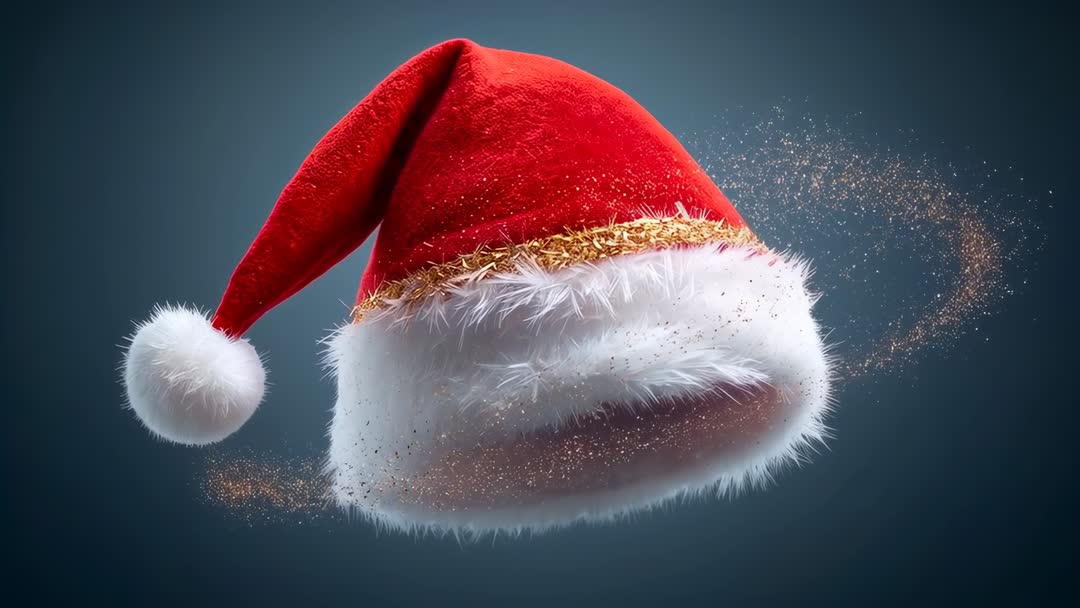 AI Generated Video. Showcasing rotating Santa hat revealing gold tinsel and shimmering halo, loopable clip for holiday motion graphics. Featuring plush velvet texture, fluffy fur trim and soft pompom for tactile, premium look. Providing clean dark studio background and suspended floating composition for easy overlay with logos, text and countdown timers. Working well for social media reels, email campaigns, website hero banners, digital signage, video openers and greeting card animations. Pairing with warm gold accents and bold sans-serif typography for high-impact seasonal promotions. Delivering high-resolution loop ready for 1080p or 4K export and seamless playback across platforms. Use as overlay, background or centerpiece in holiday ads, product launches, storefront displays and festive storytelling.