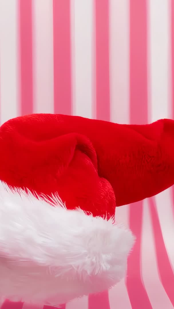 AI Generated Video. Video showing rotating red Santa hat swinging on play start over pink and white striped backdrop, highlighting plush velvet body and fluffy white fur trim with pom-pom. Close-up framing creating strong vertical composition ideal for mobile platforms. Loop-friendly motion making smooth transition for short-form content. Allowing text overlay or logo placement in top area while keeping hat movement centered. Color palette offering bold red and soft pink for playful seasonal themes. Using for holiday marketing, social media ads, Instagram Reels, TikTok, YouTube Shorts, and app splash screens. Using as festive background for product displays, greeting animations, holiday countdowns, and thumbnail stills. Providing cheerful, cozy mood for branding and winter campaign promotion.