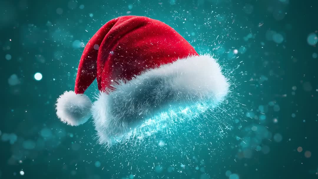 AI Generated Video. Rotating red Santa hat with fluffy white fur trim and glowing turquoise brim emitting sparkling particles over teal bokeh. Camera orbiting hat while tiny light particles and sparks exploding outward, creating festive motion and magical energy. Serving holiday video intros, social media reels, digital banners, seasonal advertisements, greeting card animations, retail display loops. Providing background for product shots, event promotions, email headers, countdown clips, streaming overlays. Color palette favoring rich red, cyan glow and deep teal, enhancing contrast and branding flexibility. Suitable for motion graphics, compositing, VFX workflows, and festive campaign creatives. Ideal for looping animations and quick attention-grabbing hero visuals.