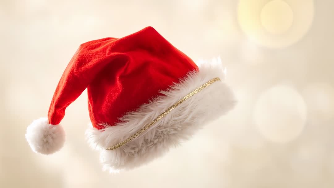 - Rotating Santa Hat with Gold Trim and Fluffy Pom Pom over Warm Bokeh — Holiday Video Loop