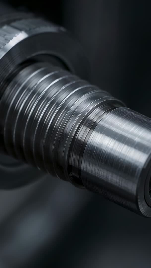 AI Generated Image. Footage showing rotating steel threaded shaft held in lathe chuck, revealing spiral grooves and polished machining finish. Close-up macro framing capturing texture, concentric tool marks and reflective surface. Lighting accentuating metallic sheen and depth of grooves. Footage suiting industrial branding, manufacturing process videos, technical training, machine tool demonstrations or product pages for metal parts. Vertical orientation optimizing for mobile use, social media Reels, Stories and short-form tutorials. Footage fitting as background for engineering presentations, video transitions or visual detail in quality control and inspection content. Color grading suggesting cool desaturation for technical look or high contrast for dramatic industrial feel.