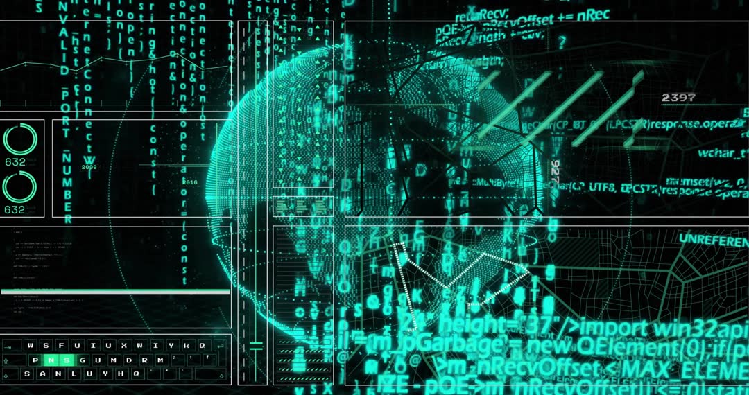- Rotating Teal Wireframe Globe with Sliding HUD Panels and Streaming Code During System Boot