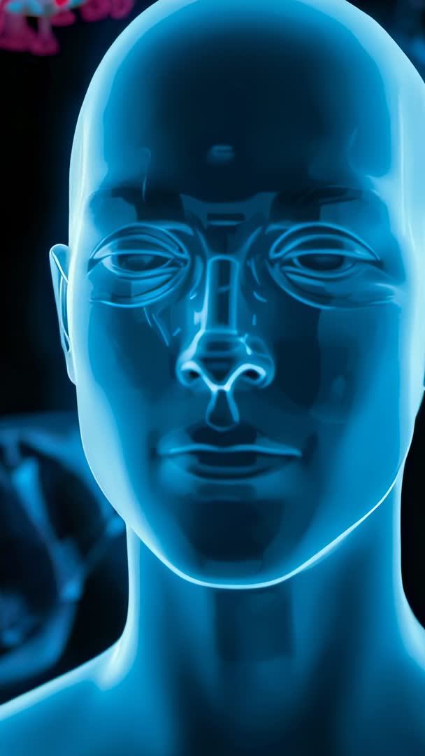 AI Generated Image. This vertical video showing rotating translucent 3D head revealing DNA helix and virus particles in neon cyan virtual lab. Rendering high contrast cyan glow with subtle internal facial outlines and transparent cranium layers. Working well for medical animation, biotech marketing, scientific presentations, health education, and futuristic technology demos. Using as loopable background for social media vertical ads, smartphone app intros, conference visuals, e-learning modules, and explainer sequences. Allowing room for overlay text and branding near forehead or chest areas. Suitable for projects on neuroscience, genomics, virology, anatomy lessons, diagnostic tools, and AR/VR concept previews.