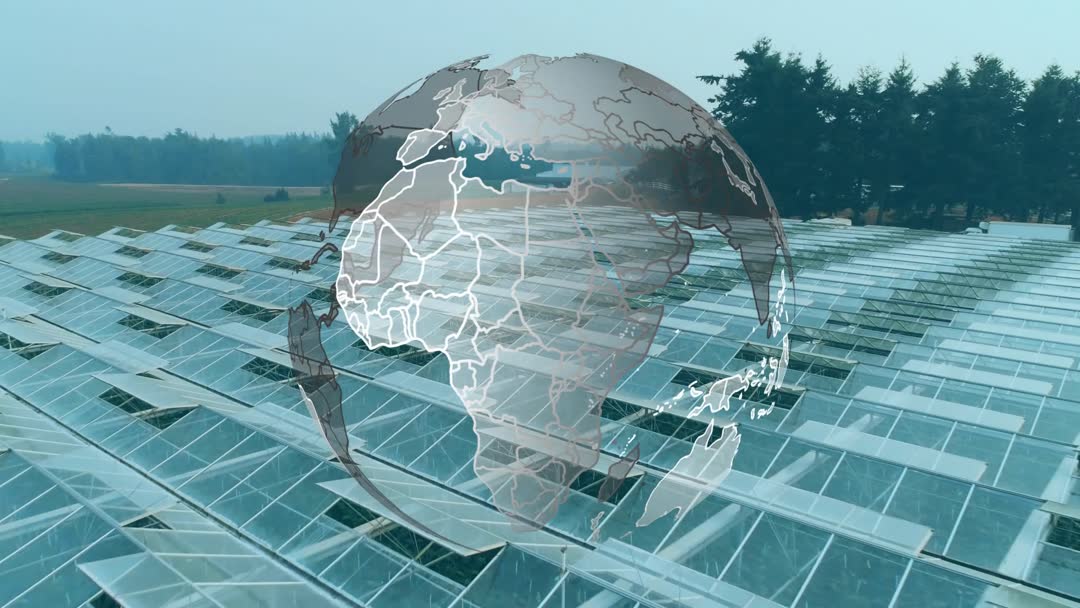 - Rotating Translucent Globe Hovering Over Aerial Greenhouse Rooftops Conveying Global Reach