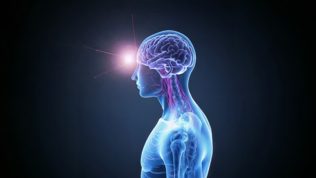 AI Generated Image. Rotating translucent human model showing internal brain structure, cranial nerves, and spinal cord with glowing forehead flare and radiating light rays. Highlighting neural pathways and synaptic connections with magenta nerve tracts against deep blue background for high contrast. Using semi-transparent torso to reveal skeletal contours and upper airway anatomy while maintaining focus on cerebral region. Presenting smooth rotation and subtle camera parallax for cinematic, educational feel. Suitable for medical education, neuroscience lectures, research presentations, anatomy tutorials, healthcare marketing, and technology concept visuals. Ideal for website hero banners, explainer videos, conference backdrops, e-learning modules, brochure covers, and social media clips. Allowing easy integration with voiceover, animated labels, color grading, and motion graphic overlays for customization and branding.