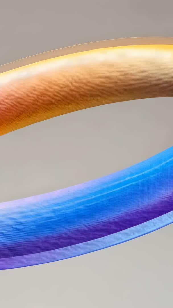 AI Generated Image. Featuring rotating tubular ribbon looping across neutral grey backdrop, colors shifting from warm gold to cool blue while ribbon undulating with soft reflections. Smooth seamless loop designed for vertical 9:16 displays and loop-ready playback. Ideal for social media stories, reels, mobile ads, app intros, technology branding, and futuristic product promos. Useful as motion background for website hero, presentation slide, digital signage, and music visualizer. Allowing adjustable playback speed and color grading for matching brand identity and campaign tone.