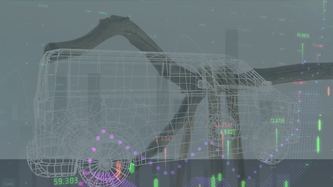 3D animation of a wireframe van rotating in front of green screen background with various financial data and graphs displayed use is ideal for presentations, educational materials demonstrating correlations between transportation and market analytics, or backdrop videos for tech-focused scenarios.