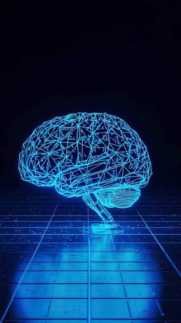 AI Generated Image. Rotating wireframe brain glowing over reflective grid, pulsing timeline advancing through stylized neural pathways. Ideal for tech branding, AI product demos, conference openers, and explainer videos. Use as looping vertical video background for mobile reels, app intros, social media stories, and keynote slides. Combine with on-screen text and data overlays to illustrate machine learning concepts, neural network training, data flow, or digital innovation. Color grading and speed adjustments allowing match with brand identity. Licensing suited for advertising, editorial features, corporate training, and educational content.