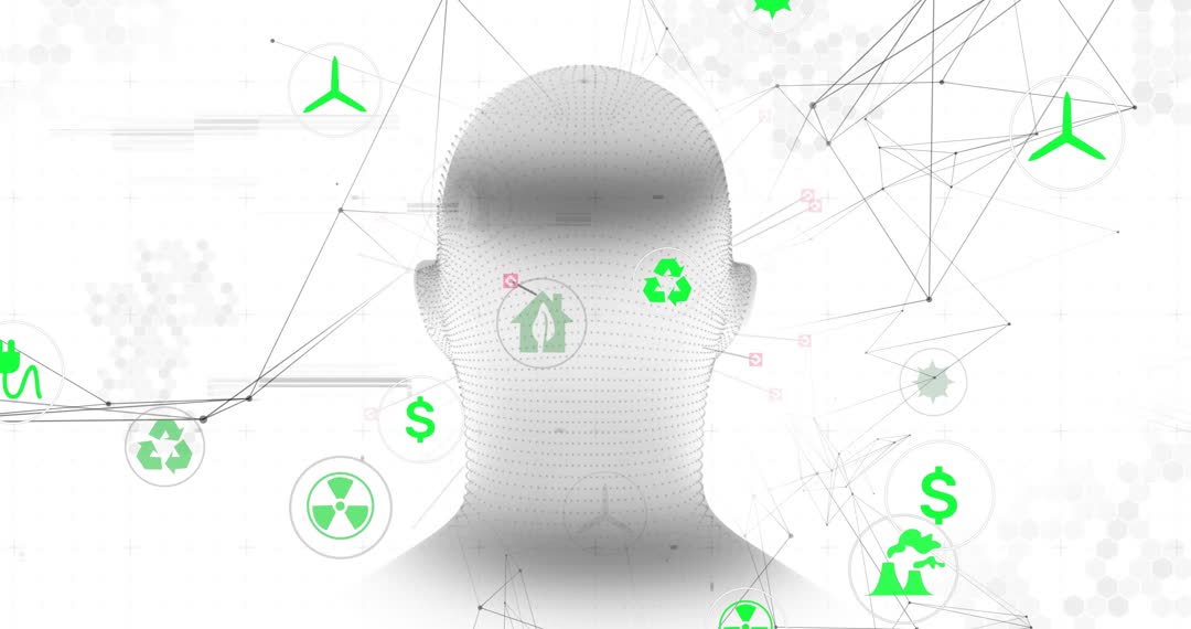 Looping video showing rotating wireframe head with orbiting green icons representing recycling, nuclear hazard, dollar, wind turbine, home energy. Glitch lines and hexagonal grid forming network nodes, conveying AI-driven energy analytics and environmental data mapping. High-contrast monochrome palette with vivid green accents, minimal composition allowing overlaying of titles or infographics. Use for tech presentations, sustainability reports, energy sector pitches, AI and IoT demos, environmental documentaries, news openers, website hero backgrounds, app intros, social media ads. Clip offering editing-friendly space for lower third graphics and logo placement. Loopable clip providing seamless loop for broadcast and digital platforms.