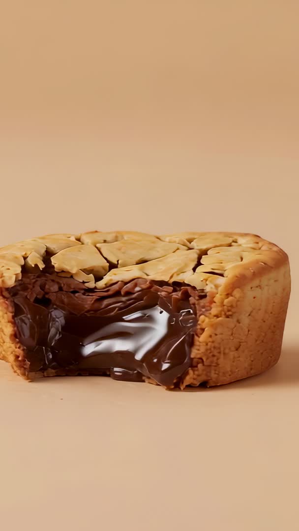 AI Generated Video. Vertical video showing round chocolate ganache tart being sliced, glossy molten chocolate oozing out while crumbs settle on warm beige background. Close-up framing and vertical orientation making footage ideal for mobile-first platforms and short-form recipe reels. Footage working well for dessert advertising, bakery branding, menu hero shots, packaging mockups, culinary blogs and social media campaigns. Slow-motion cut or macro crop enhancing texture of glossy filling and crumbly crust while leaving upper negative space free for text overlay or logo. Color palette featuring warm beige and rich brown matching premium, cozy, indulgent brand messaging. Use with recipe voiceover, ambient bite sound or slow instrumental for ASMR-driven content; pair with simple sans-serif typography and bold call-to-action.