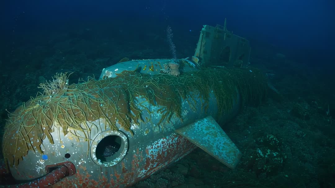 AI Generated Image. Underwater footage showing ROV panning toward sunken mini-sub resting on ocean floor. Hull covered in kelp and encrusting organisms, open porthole hinting at interior, small bubbles rising from wreck. Close-up revealing fin and corroded metal, surrounding seabed fading into deep blue. Mood conveying mystery, discovery, and long-term interaction between manmade craft and marine ecosystem. Ideal for documentary sequences on deep-sea exploration, marine archaeology, wreck investigation, or salvage operations. Useful as B-roll for news segments, museum displays, educational resources on ROV technology, or promotional content for ocean research organizations. Suggested treatments include slow cinematic reveal, subtle color grading to enhance blue-green tones, added ambient underwater sound or sonar pings, and use as opening or establishing shot for longer pieces.