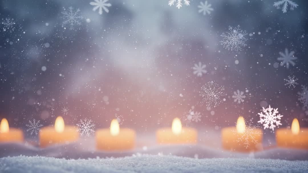 AI Generated Video. Video showing row of flickering tea candles glowing on snow, delicate snowflakes falling through soft bokeh. Warm amber flames casting gentle glow across frosty surface, creating cozy winter holiday mood. Slow, loopable motion with shallow depth of field and soft grain, working well for overlays and text placement. Suitable for holiday commercials, seasonal social media posts, Christmas greeting cards, wellness and meditation promos, spa and relaxation branding, romantic event intros, website hero banners, and retail or product displays. Suggested edits include adding subtle ambient sound or instrumental music, applying warm color grade for stronger contrast against cool blue background, and extending loop for longer runtime. Ready for use as backdrop for titles, lower thirds, end screens, and animated cards.