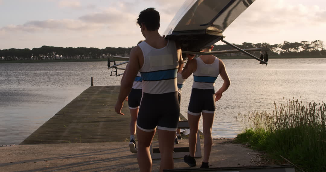 Four male rowers are walking along a wooden jetty carrying a rowing boat on a sunny day. The scene reflects teamwork, dedication, and the serene environment typical of coastal areas during sunrise. This visual is ideal for illustrating athletic preparation, team coordination, and the beauty of early morning activities. It can be used in promotional material for rowing clubs or sports events, advertisements for athletic apparel, and outdoor lifestyle content.