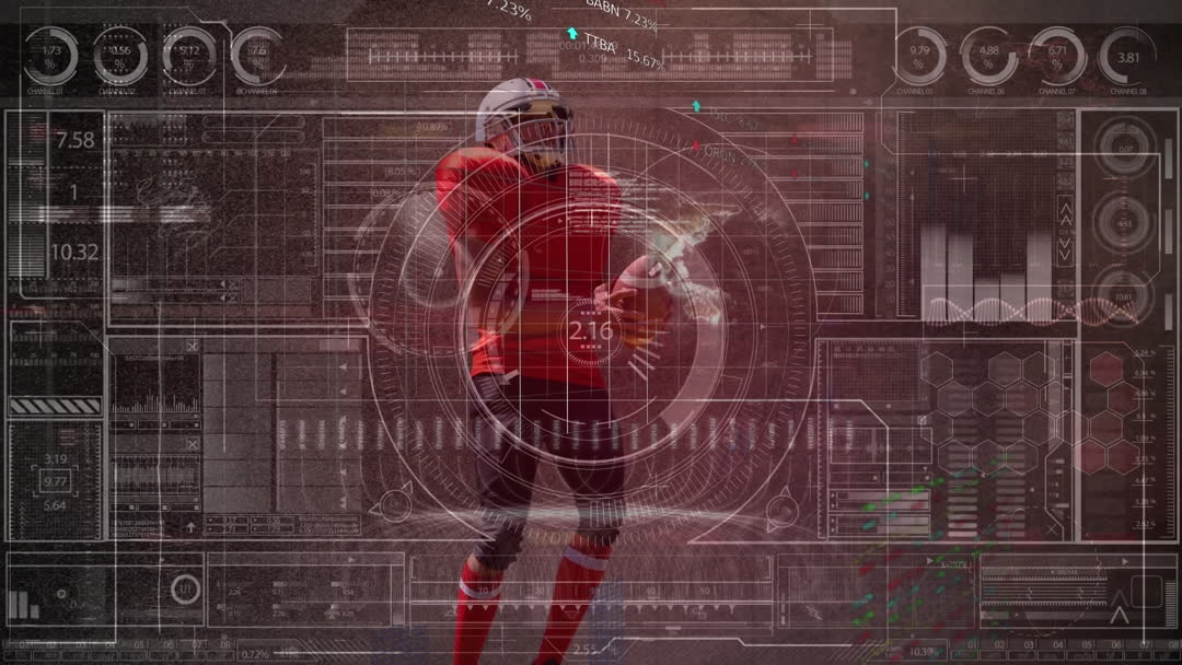 This composition blends athletic performance with advanced data analytics, showcasing a rugby player positioned among statistical graphics. This videory suits materials focused on the intersection of sports and technology, particularly in publications about sports analytics or advancements in athletic gear.