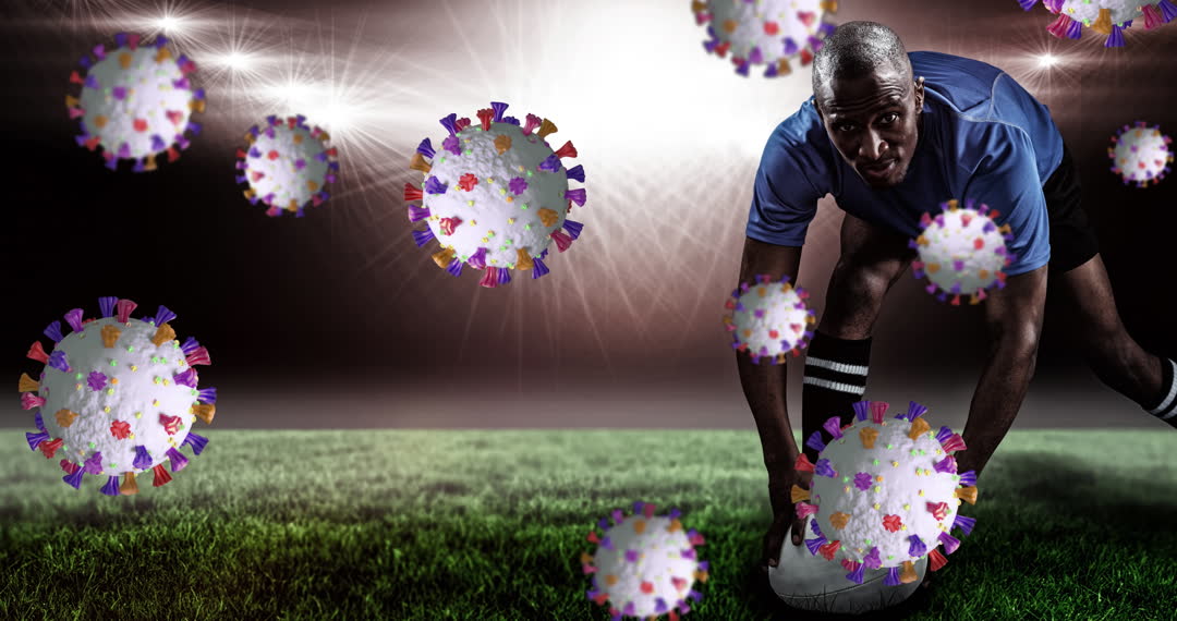 This creative composition shows a rugby player during play amidst floating representations of the COVID-19 virus. The contrast between physical activity and health concerns highlights the implications of the pandemic on sports. This video could be used in articles discussing sports during the pandemic, health awareness campaigns, or creative sports-related projects.