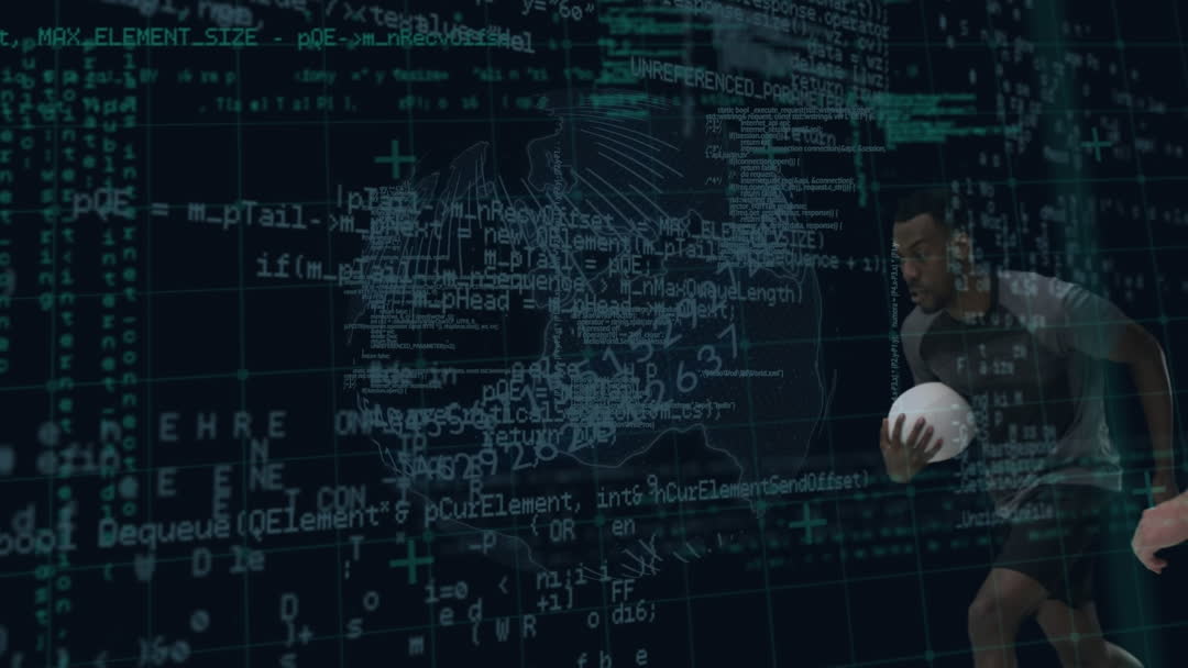 Rugby Players Amidst Digital Data and Globe Visualization Video