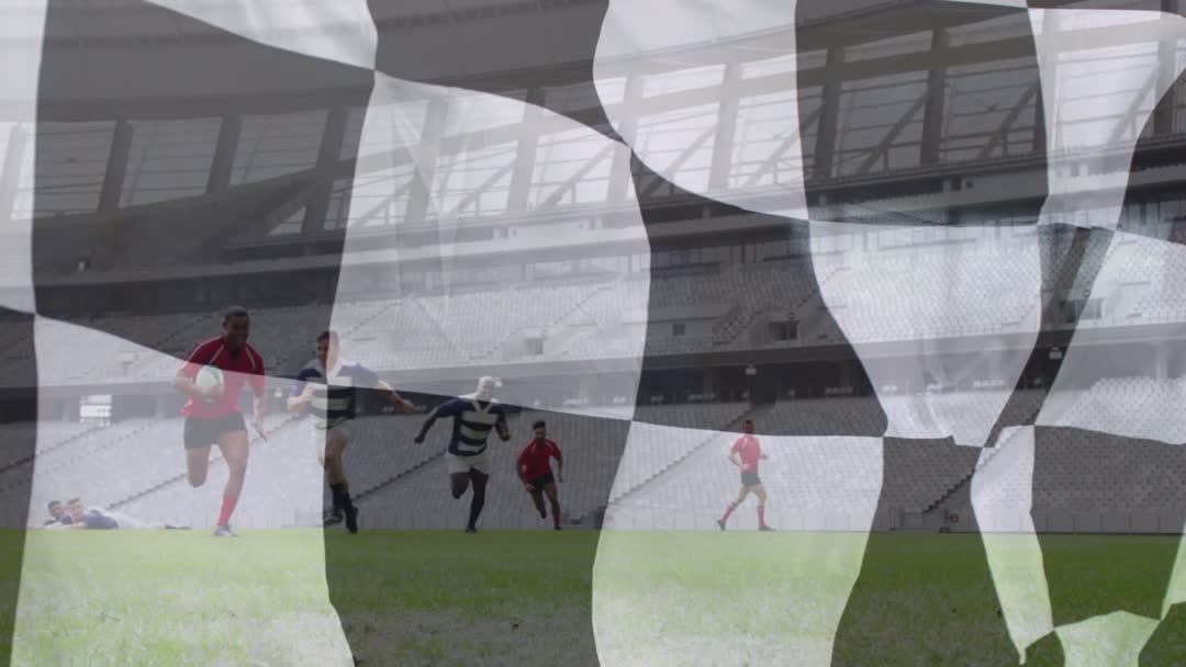 - Rugby Players Competing in a Stadium Under Checkered Flag Overlay